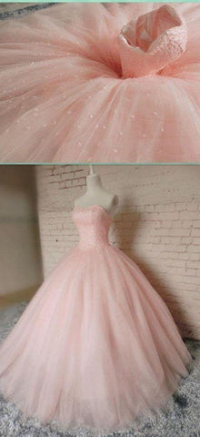 A-line blush pink long strapless tulle princess prom dresses, BD7656