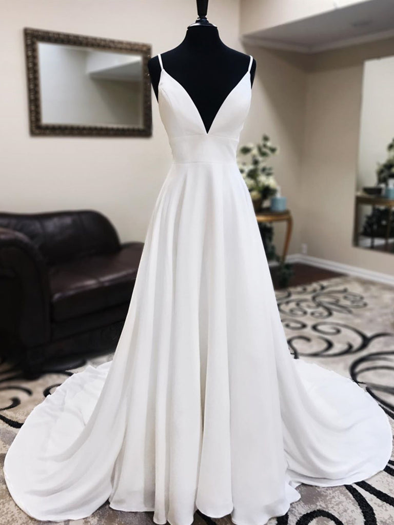 A-Line V-Neck White Wedding Dress with Lace Back, WD2302261