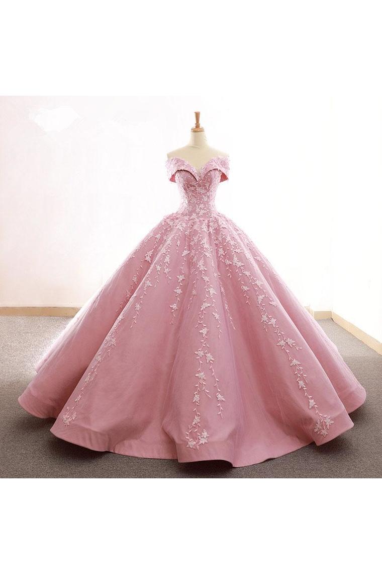 Ball Gown Off The Shoulder Satin Prom Dress With Appliques, Long Quinceanera Dress,JL20014