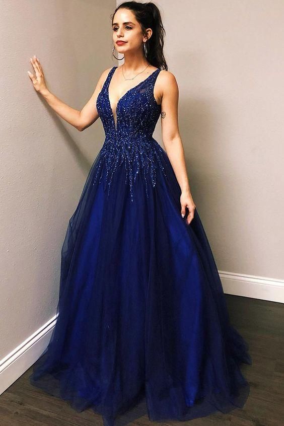 Beaded Tulle V-Neck Royal Blue A-Line Prom Dress, PD23030139
