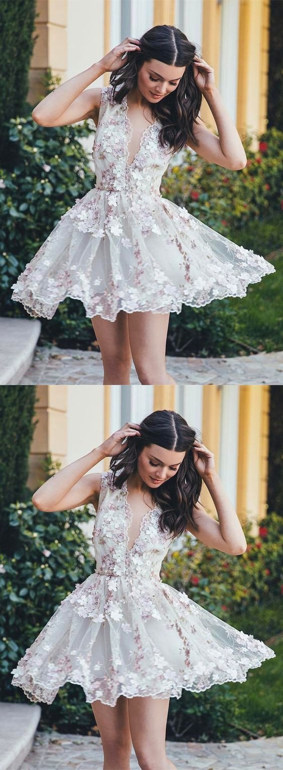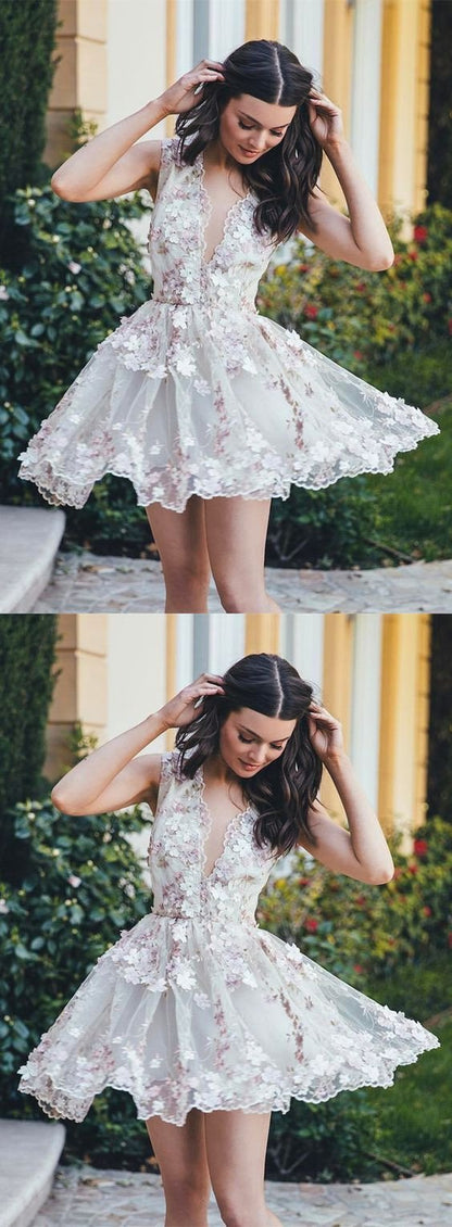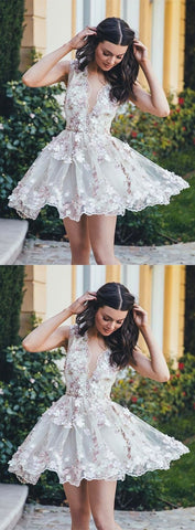 beautiful v-neck flower appliques white short homecoming dresses, HD194