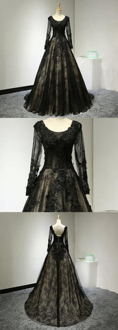 black prom dress, lace prom Dress, A-line prom dress, long sleeves prom dress, lace up prom dress, BD3901