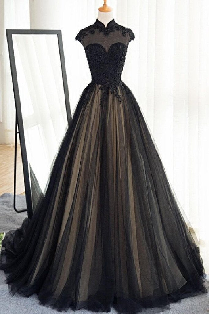 Black tulle cap sleeves floor-length long prom dresses,luxury dresses,BS023