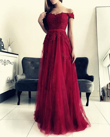 Burgundy A-Line Tulle Off Shoulder Sweetheart Prom Dress, PD2306262