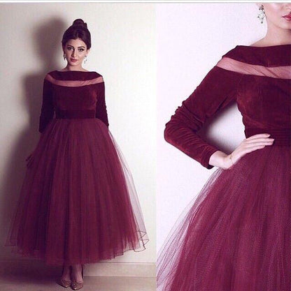 burgundy long sleeves tea-length tulle charming homecoming dresses, BD39869