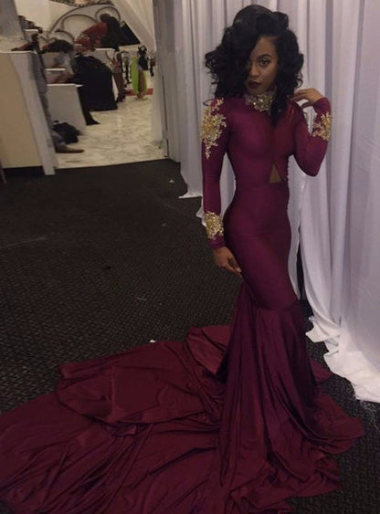 Burgundy Mermaid Long Sleeves Sweep Train Prom Dress, PD23031313