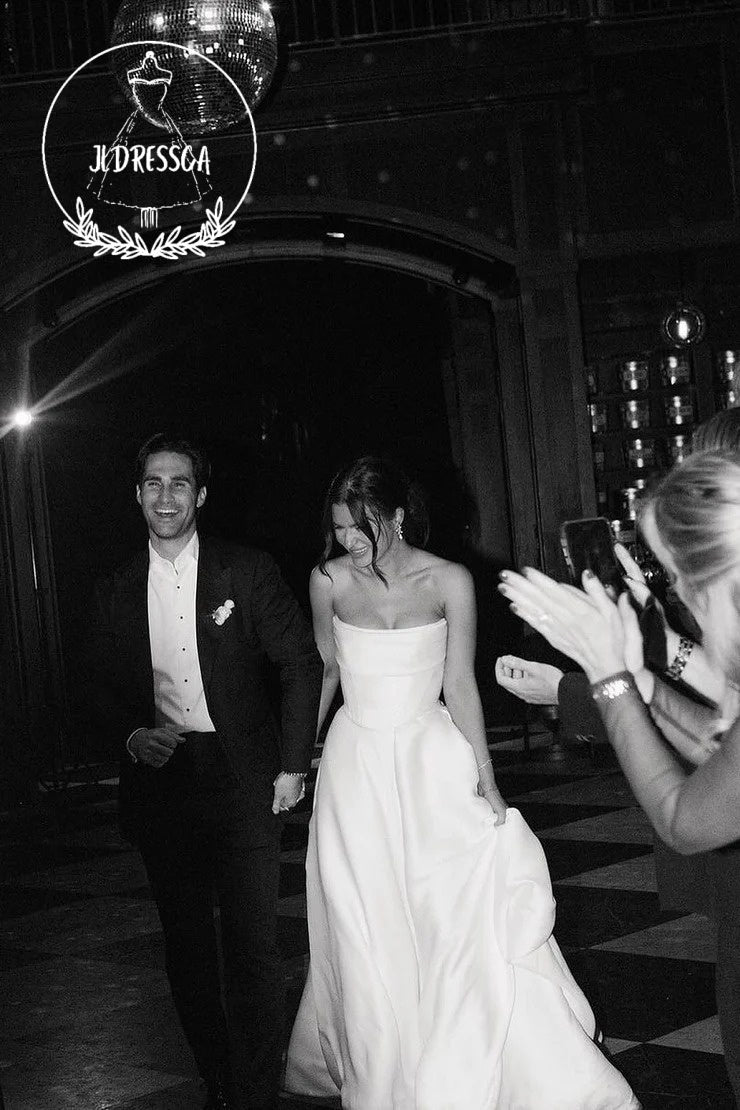 Enhance your bridal look with our Charming Long White Strapless Satin A-Line Wedding Dress. The sleek satin material exudes elegance while the strapless design and A-line silhouette flatter your figure. The daring slit adds a touch of allure to complete your perfect wedding day look.