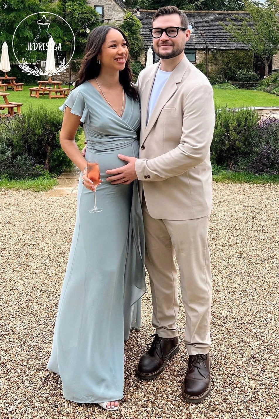 This chiffon bridesmaid dress features a timeless A-line silhouette with a tasteful slit, offering both elegance and ease of movement. The flared sleeves add a subtle, sophisticated flair, enhancing the dress’s graceful flow. Crafted for comfort and style, it’s an ideal choice for formal occasions where understated refinement is key.