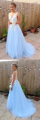 Elegant Blue Chiffon A line V Neck V Back Tulle Lace Long Prom Dresses, Evening Dress,BS031