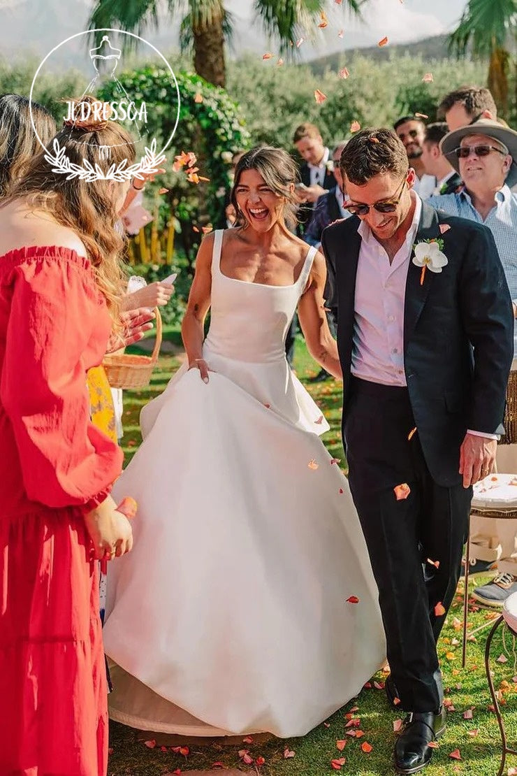 Elegant Square Neck White Satin Wedding Dress with Bow, WD25023