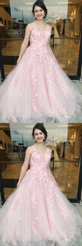 Floral Applique Long Prom Dresses V-Neck Evening Dresses Tulle A-Line Formal Dresses,BS035
