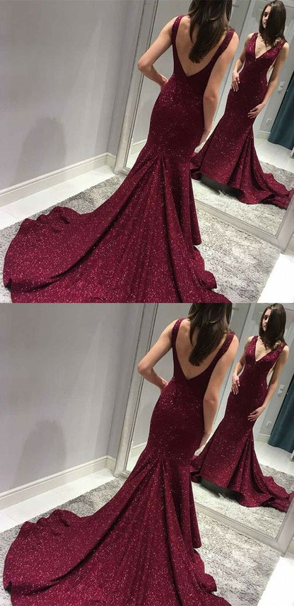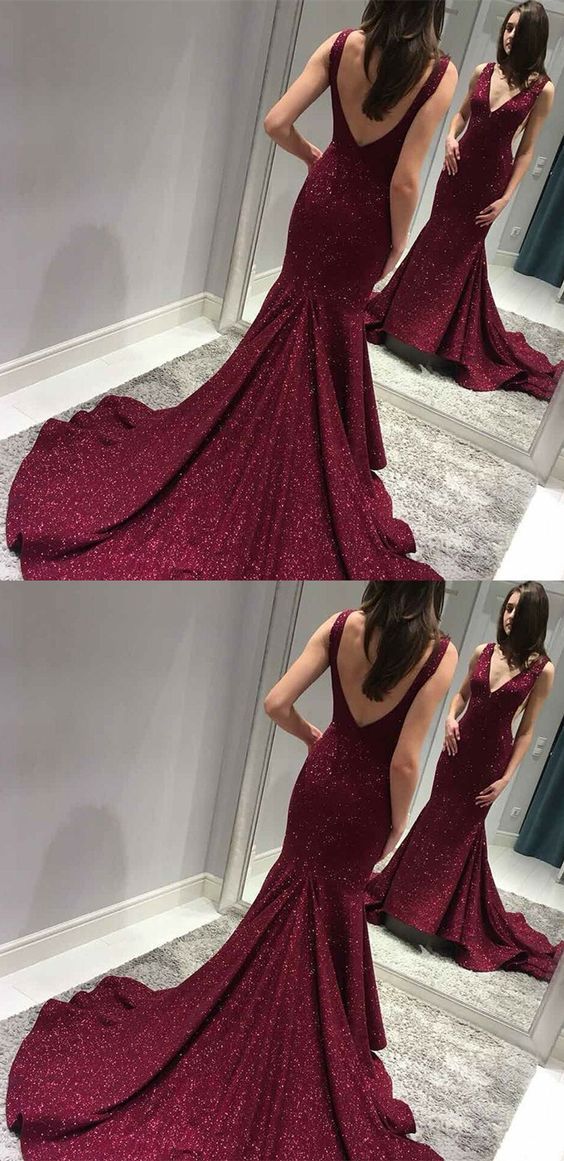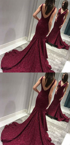 formal charming burgundy sparkle v-neck long mermaid prom dress, PD5898