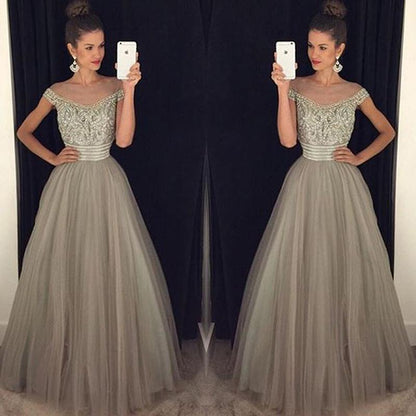 formal off shoulder A-line grey long tulle prom dress, PD5891