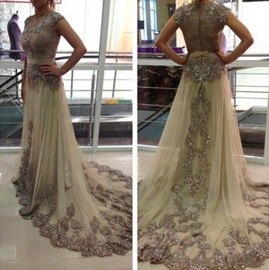 gold prom dress, long prom dress, charming prom dress, cap sleeves prom dress, tulle evening dress, BD516
