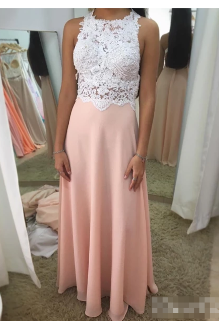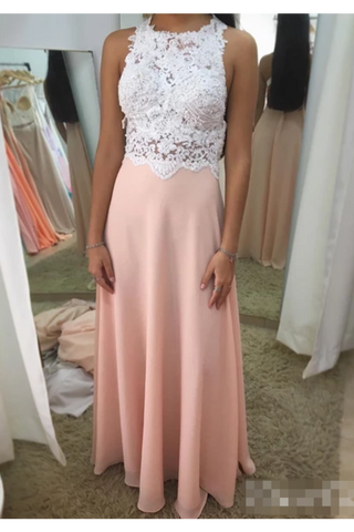 Halter Neck Ivory Top Beadings Blush Crepe Chiffon Prom Dresses,JL20048