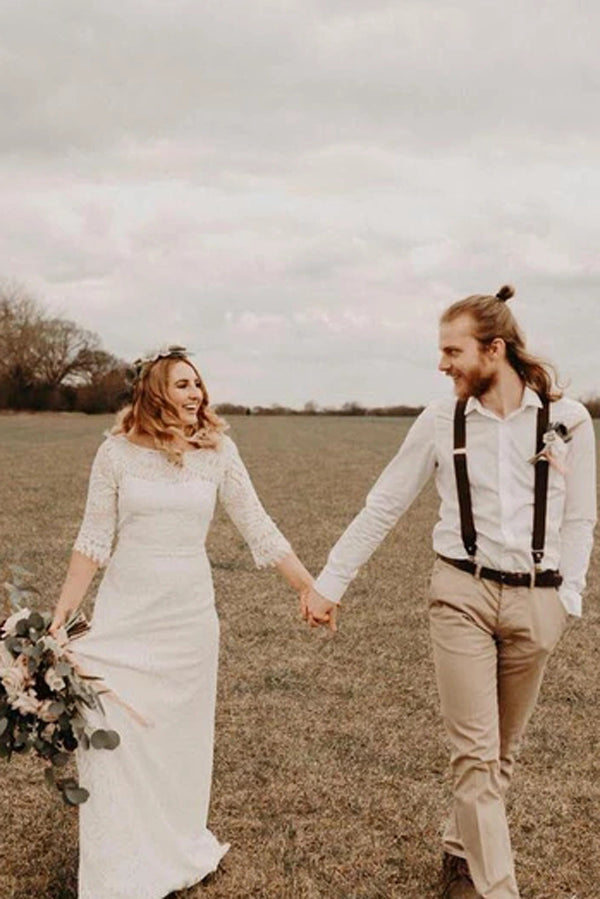 Ivory Lace Bateau Neck A-line Bridal Dress with 3-4 Sleeves, WD2303190