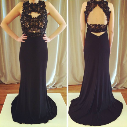 lace top black long open back prom dress, PD9674