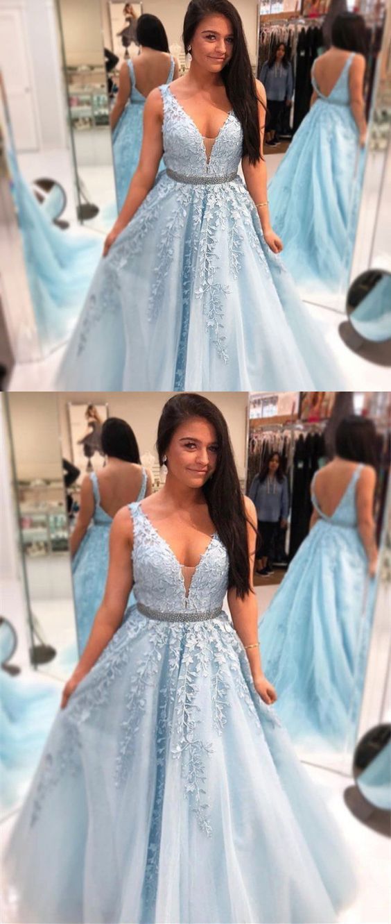 light blue v-neck long A-line prom dress new arrive ball gown, BD1630