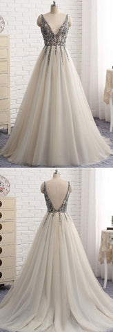light gray tulle v-neck long tulle sequin top prom dress, PD4492