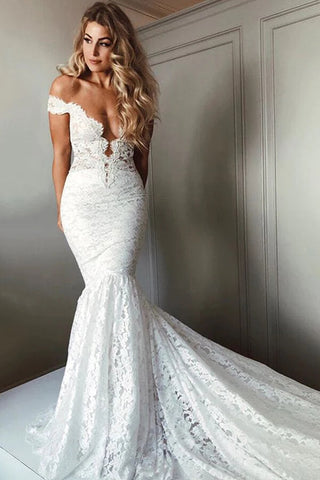 Mermaid Off-the-Shoulder V-neck Court Train Lace Wedding Dress, WD2303163