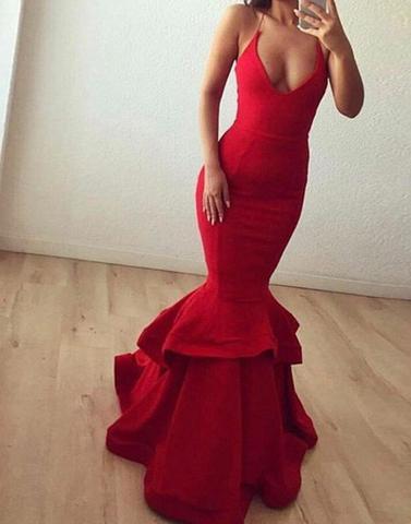 mermaid red spaghetti straps long evening dress, PD1297
