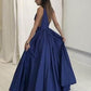 Navy Blue Deep V-Neck A-Line Satin Prom, PD2305249