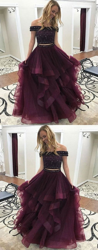off shoulder beaded top two pieces burgundy long prom dress, PD8873