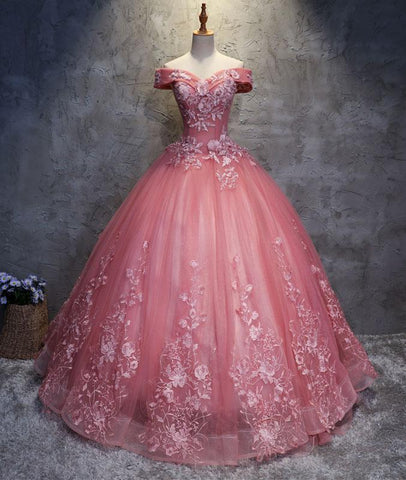 off shoulder pink lace appliques A-line prom dress, PD1454
