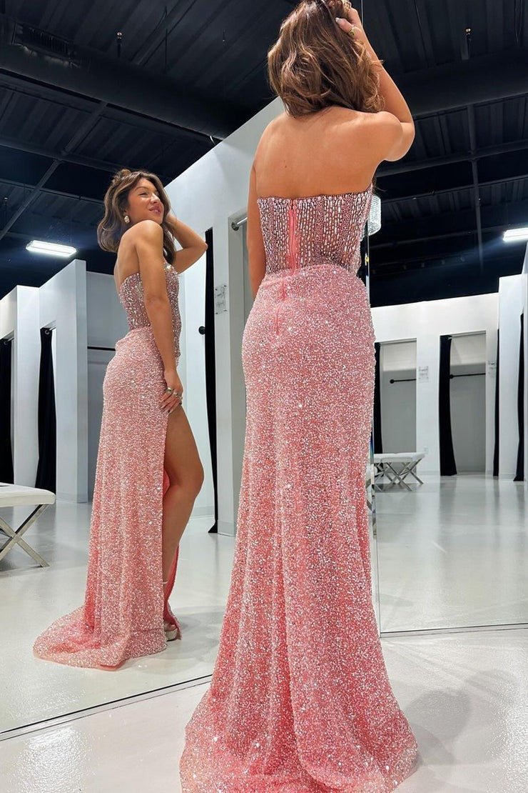 Pink Sequins Strapless Mermaid Long Prom Dress with Beading, PD25438