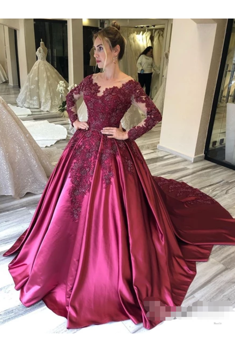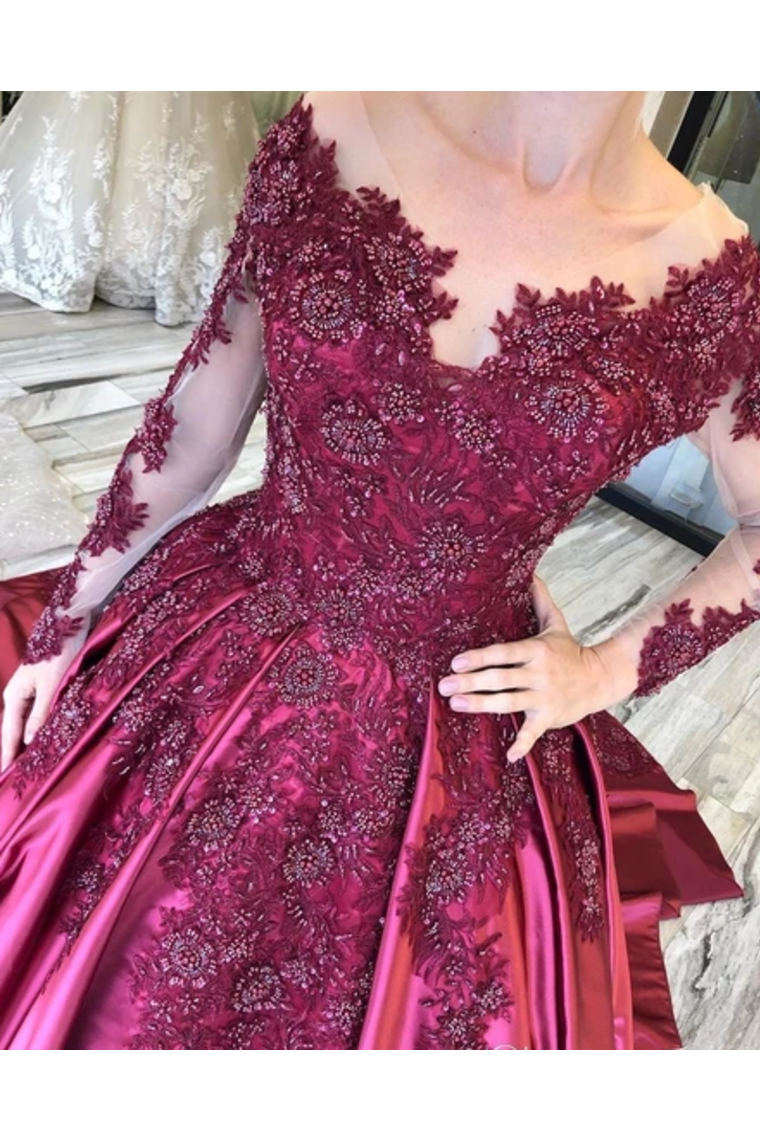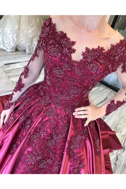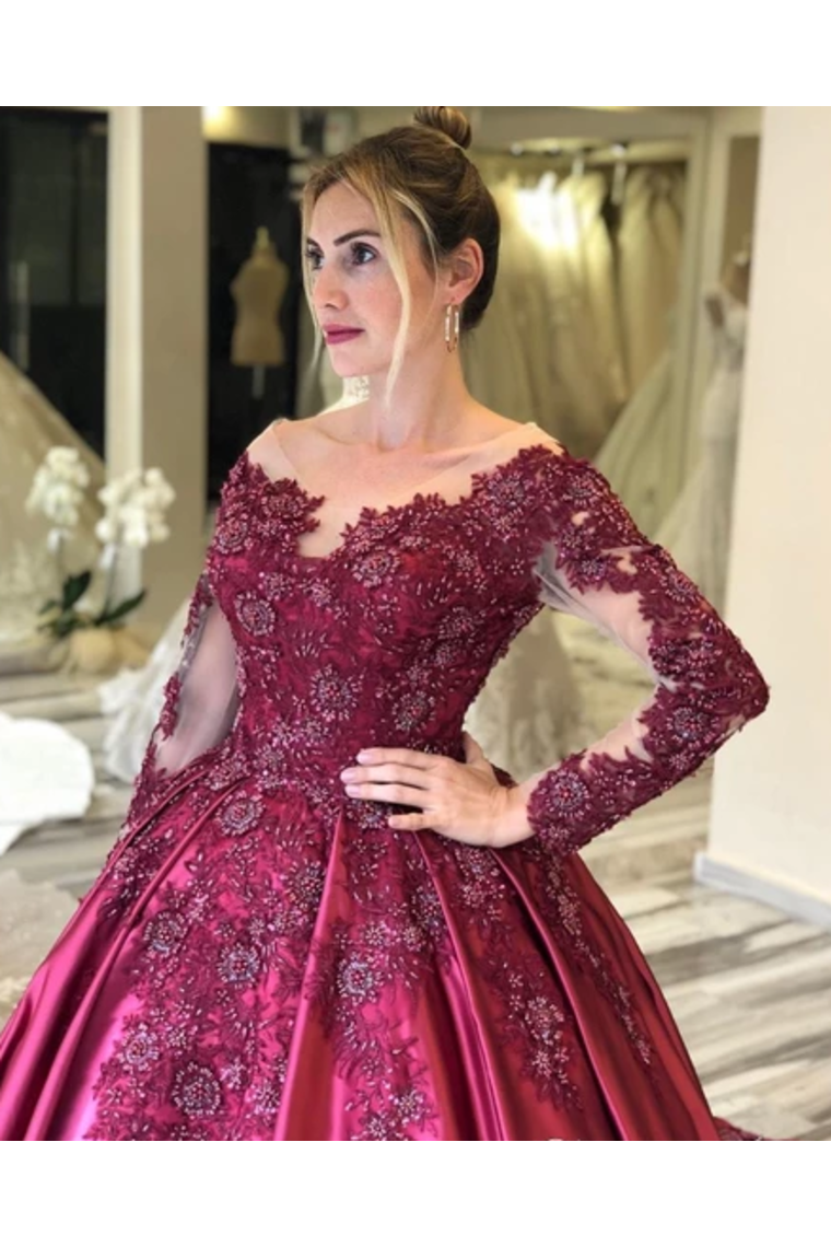 Prom Dress With Long Sleeves And Floral Embroidery Burgundy Colored Court Train,JL20119