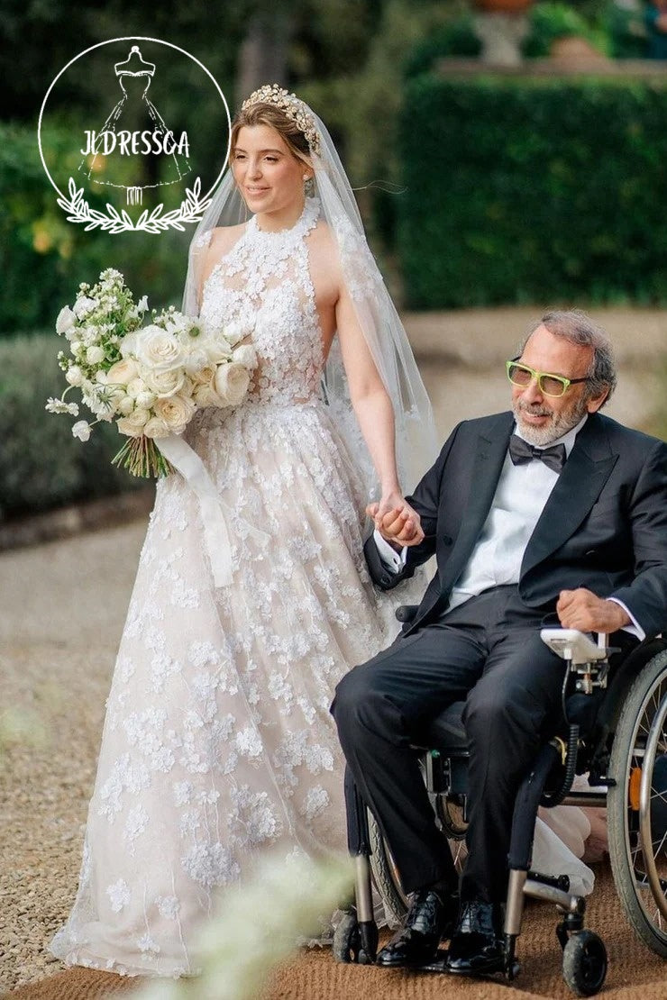 This romantic A-line wedding dress is made of luxurious tulle and features a striking halter neck and elegant appliques. Its dreamy silhouette and delicate details make it perfect for any bride wanting to make a statement on her special day. The dress is designed to enhance your natural curves and give you a timeless and romantic look.