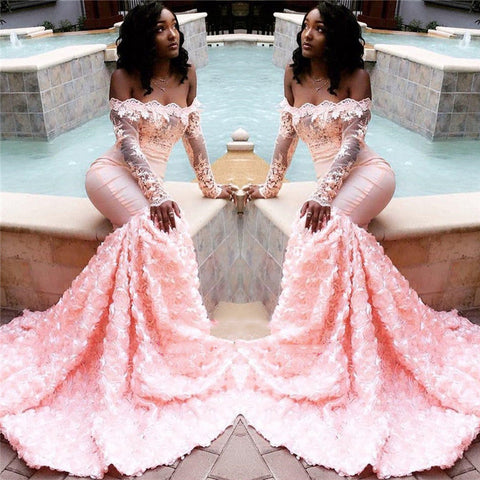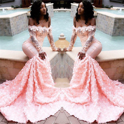 Rose Lace Off-the-Shoulder Long Sleeve Pink Prom Dress, PD2305059