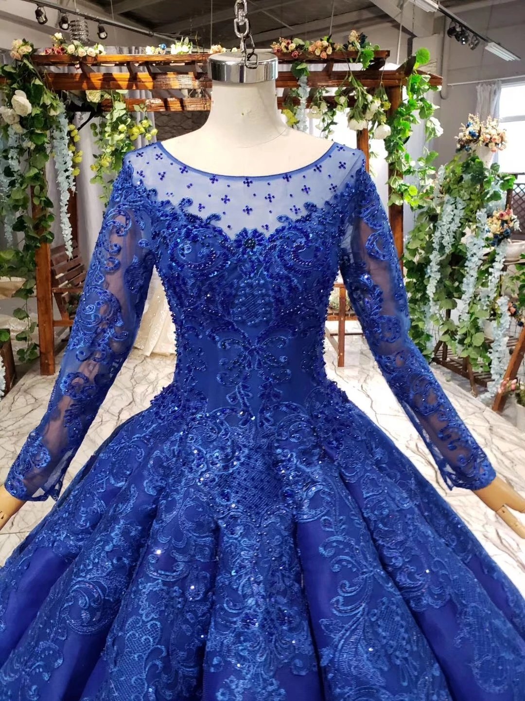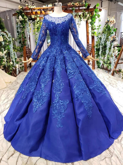 Royal Blue Appliqued Ball Gown - Long Sleeve Prom Dress, PD23022231