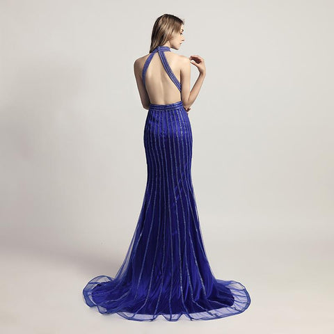Royal Blue Beaded Long Prom Dresses Mermaid Evening Dresses Backless Formal Dresses,LX479