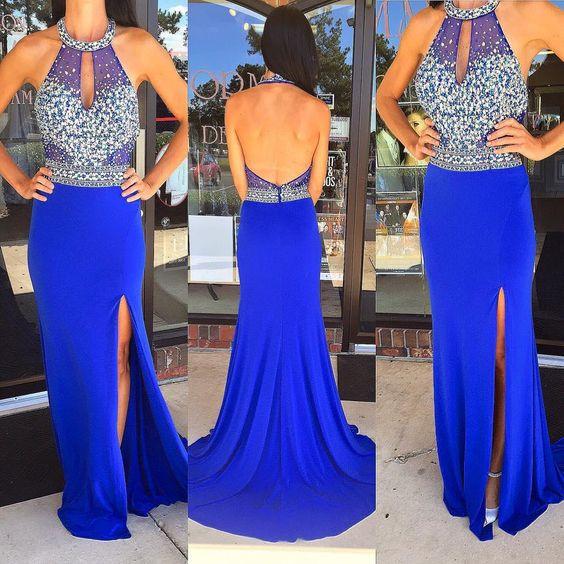 royal blue prom dress, long prom dress, beaded prom dress, halter evening dress, side slit prom dress, BD408