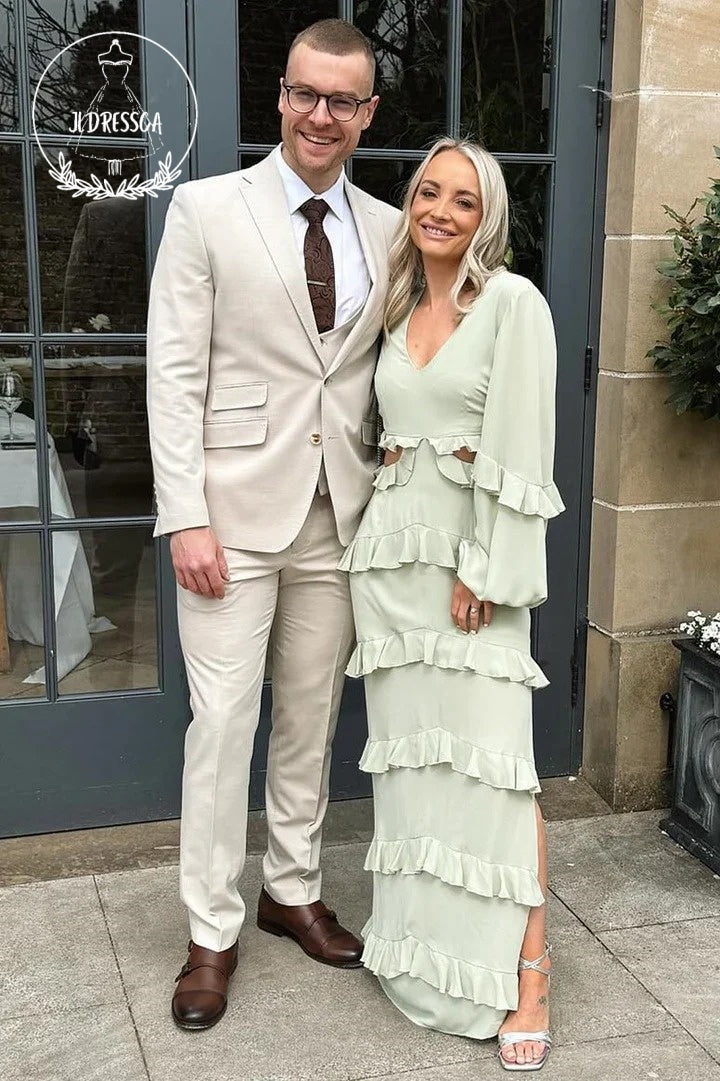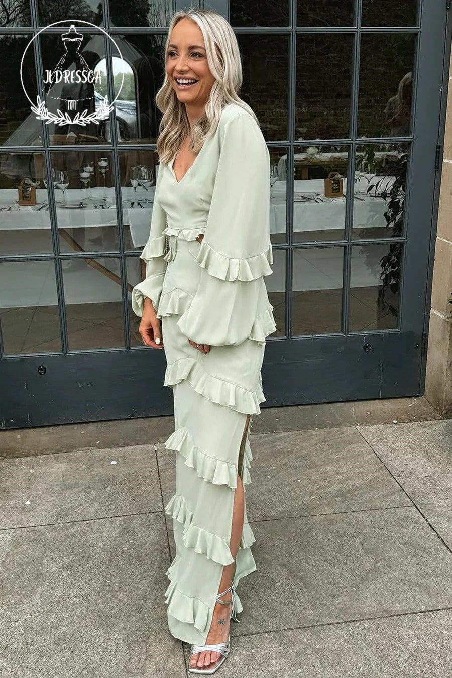 This sage sheath bridesmaid dress combines a flattering V-neckline with elegant long sleeves for a sophisticated look. Crafted to enhance the silhouette, its floor-length design features a tasteful slit that adds subtle allure and ease of movement. Perfect for formal occasions, this dress balances chic style with refined comfort.