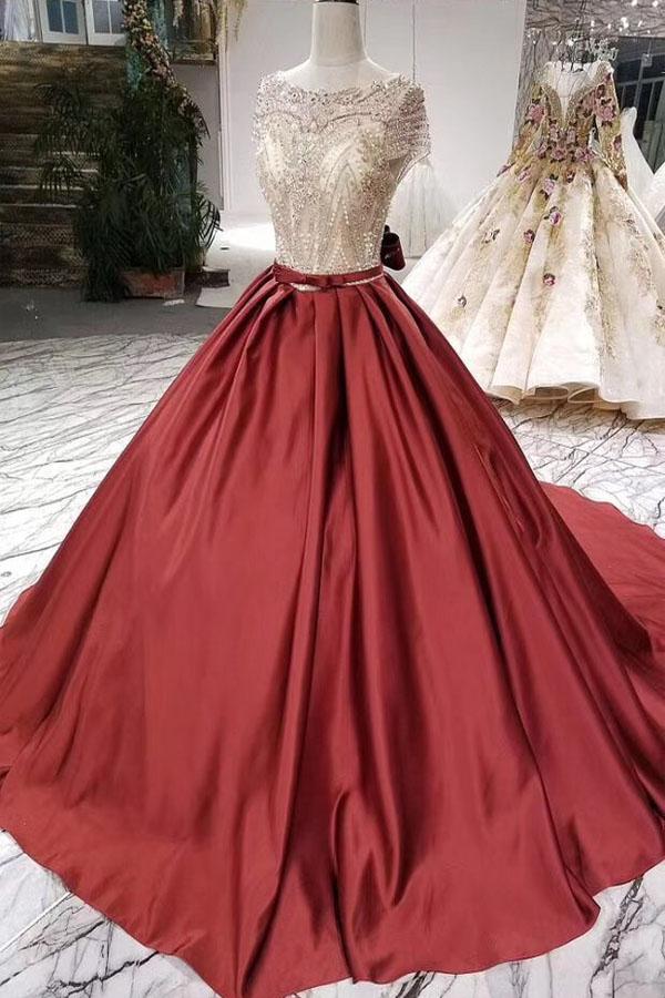 Satin Beaded Prom Dress - Long Sleeve Ball Gown, PD23022232