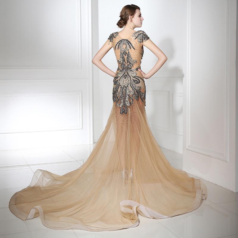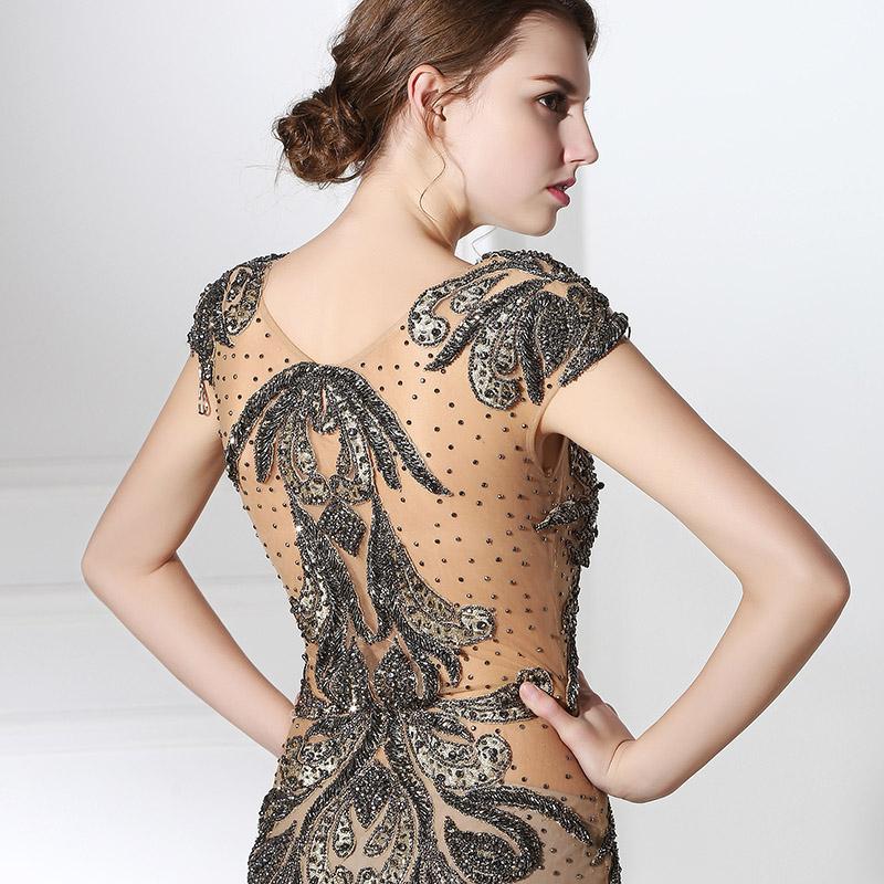Sexy Applique Beaded Long Prom Dresses Mermaid See Through Evening Dresses Cap Sleeve Formal Dresses,LX403