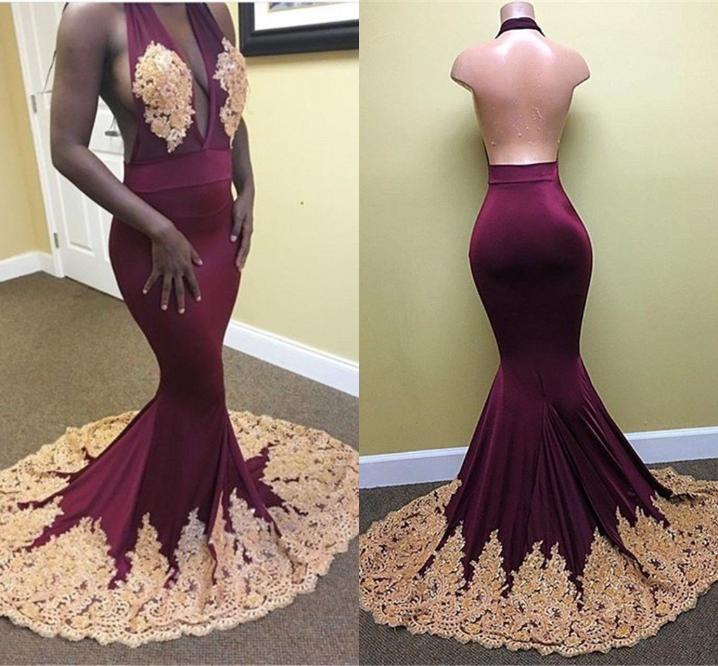 sexy halter mermaid v-neck backless burgundy long prom dress, PD1479