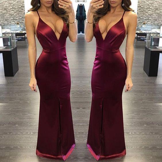sexy v-neck burgundy formal mermaid long prom dress, PD0119