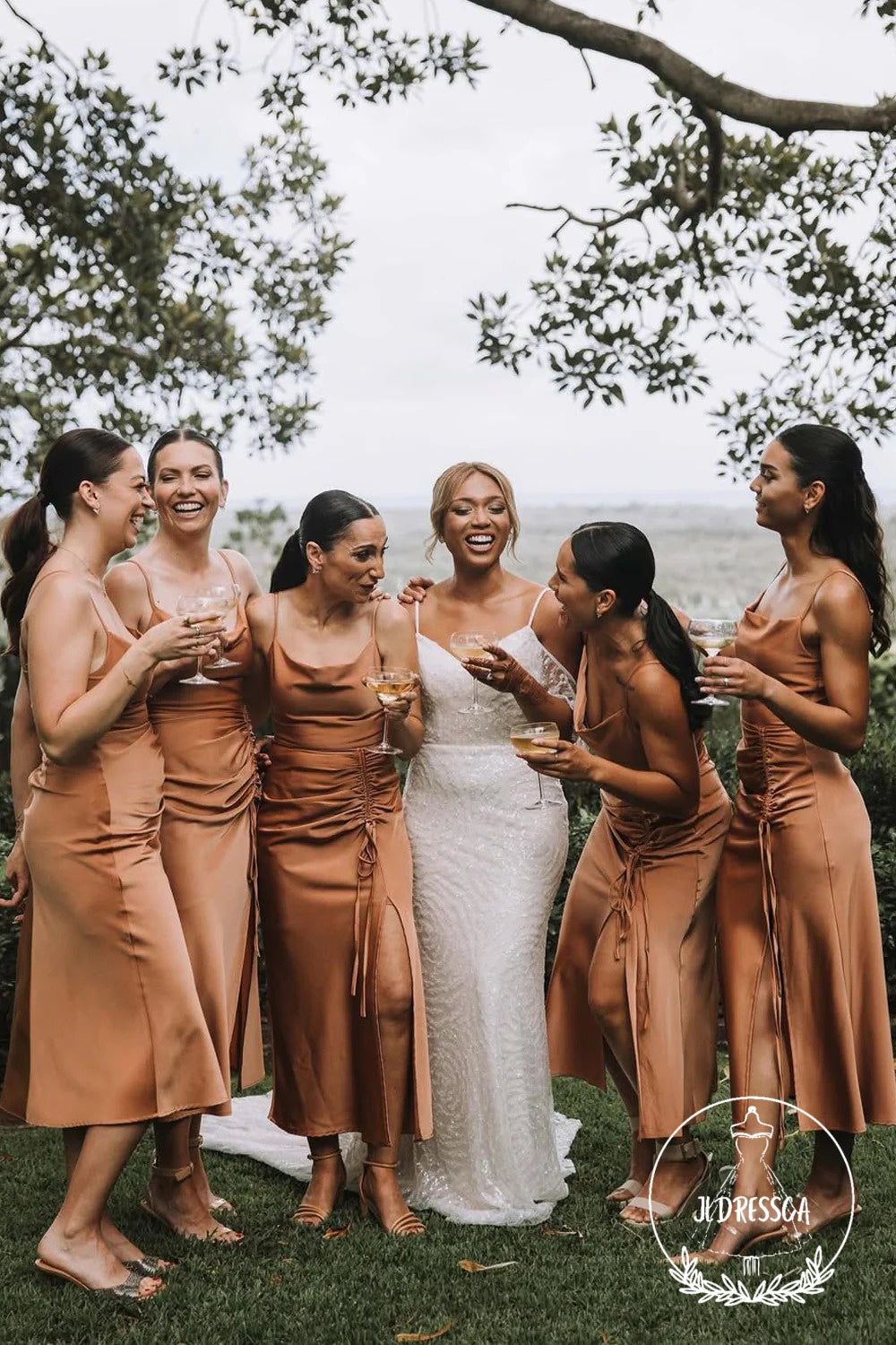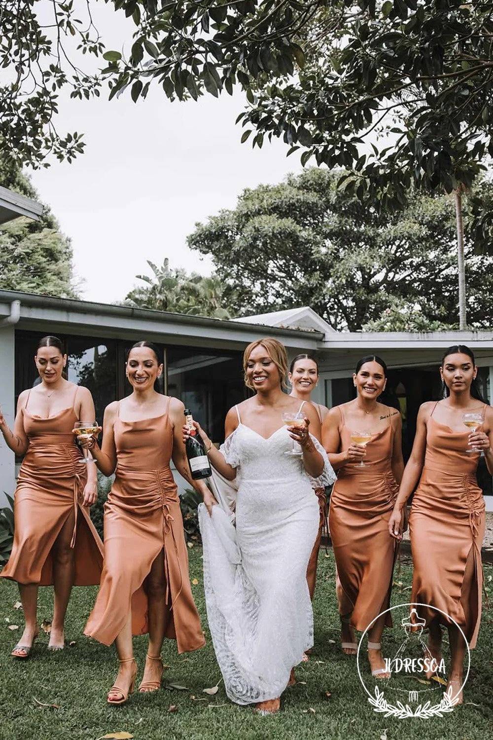 This silk satin sheath bridesmaid dress features a relaxed cowl neck that enhances its bohemian charm. Crafted from smooth satin, it offers a flattering silhouette with effortless drape and subtle sheen. Perfect for weddings seeking a blend of elegant simplicity and free-spirited style.