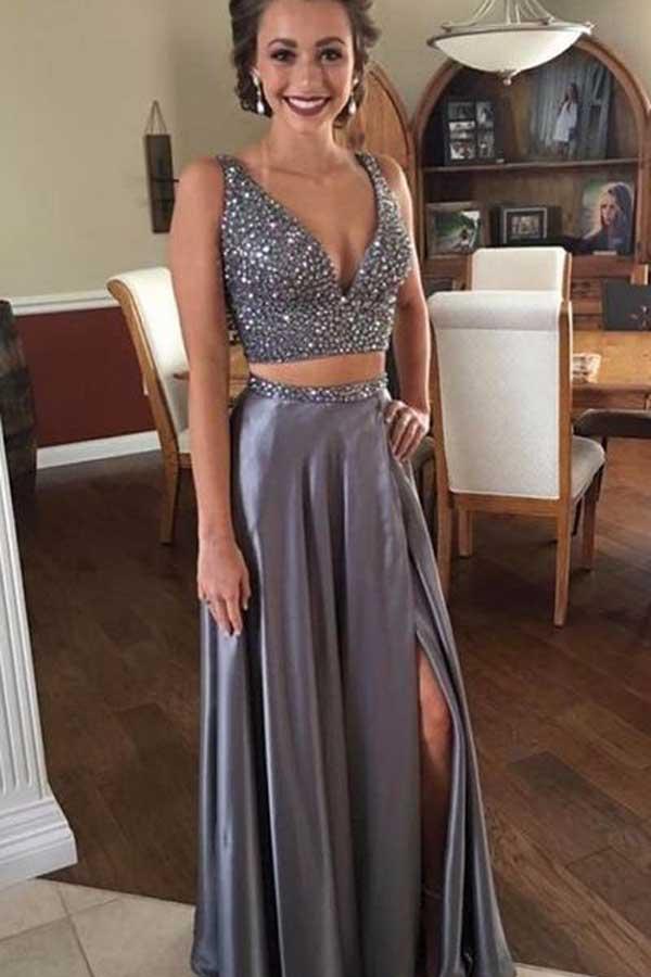 Silver Beaded Two Piece Graduation Dress, PD2302228