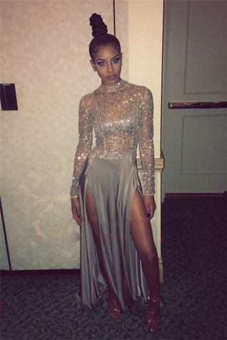 Silver See-Through Beaded High Neck Side Slit A-Line Prom Dress, PD23033118