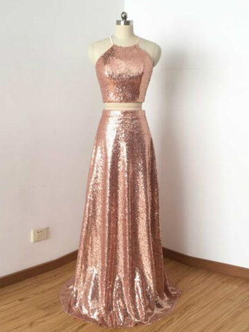 sparkle two pieces rose gold sequin long prom dress, PD12125