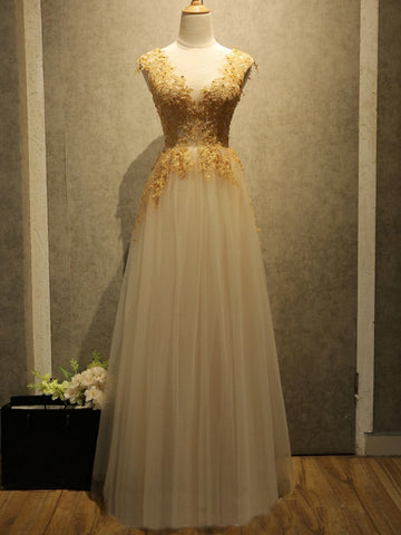tulle gold lace appliques top long prom dress, PD1699