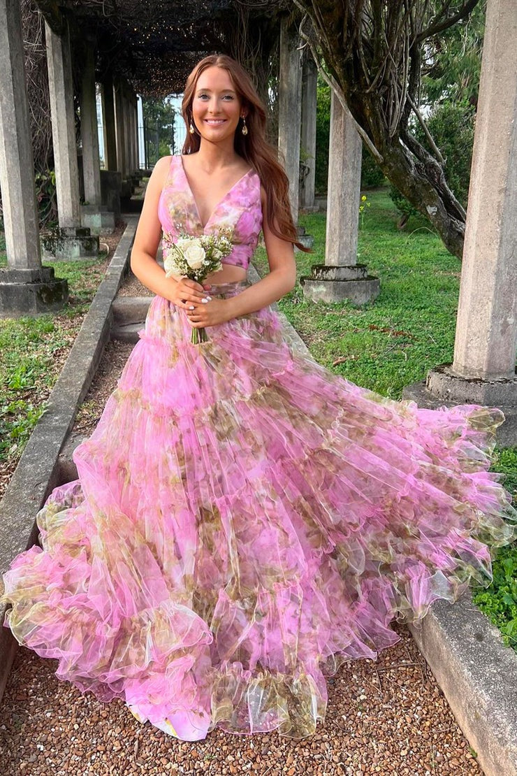 Two Piece V Neck Floral Printed Long Prom Dress, PD25169