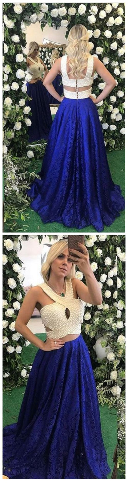 two pieces ivory beaded top with royal blue lace skirt long prom dress, PD5690