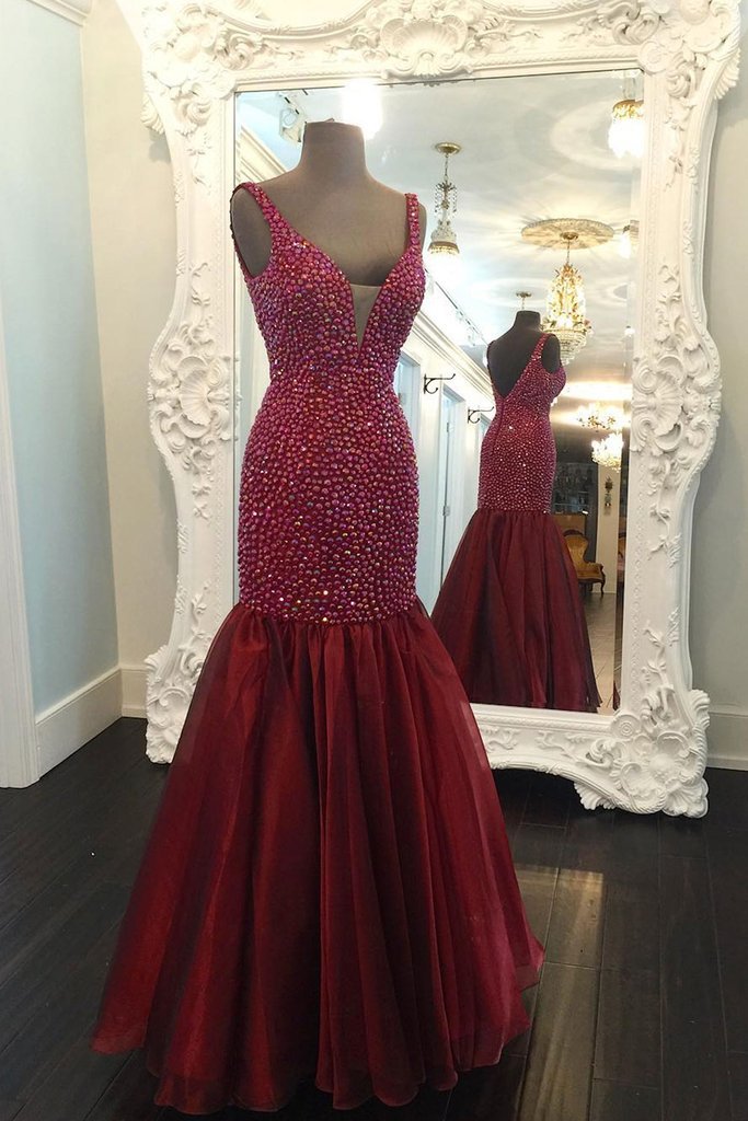 two straps beaded mermaid burgundy long prom dress, PD5488