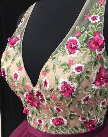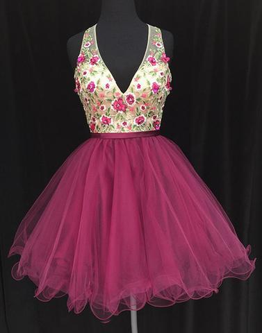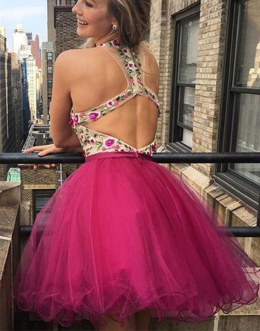 v-neck hot pink tulle short open back homecoming dress, HD544