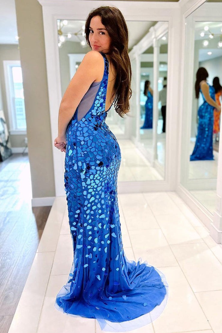 V Neck Mermaid Blue Mirror-Cut Beaded Prom Dresses, PD25028